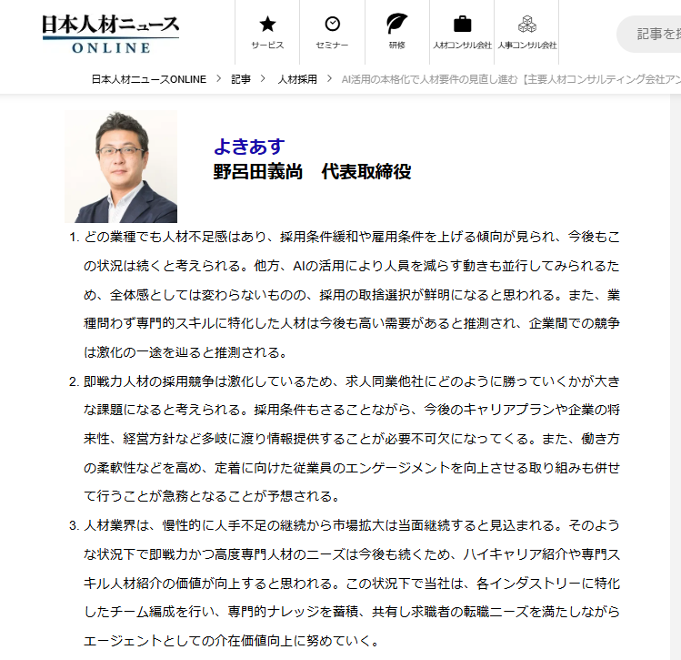 日本人材ニュースONLINEのアンケート(2026年1月13日)及び人事向け専門誌 「日本人材ニュース」(2026年1月10日発行/Vol.339)に当社代表野呂田が掲載されました